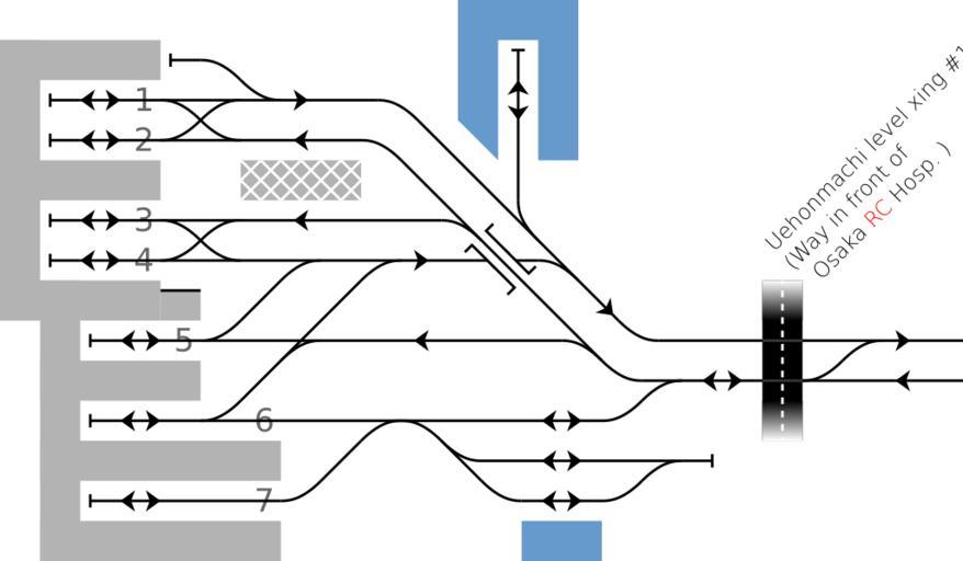 Keywords: Rail Tracks map Kintetsu Uehonmachi Station VI en.svg Kintetsu Ōsaka Uehommachi Station in Tennōji-ku Osaka Japan VI 1951-12 English version Station n track Number White crosshatch arrival platform <span style color 6699cc >Blue polygon</span> freight platform Reference material Kintetsu Corporation 50NEN NO AYUMI The corporation history of 50 years Japanese Page 84 - 85 Kintetsu Corporation 100NEN NO AYUMI The corporation history of 100 years Japanese Page 241figure 5-4 and Page 242 figure 5-5 大阪市天王寺区にある近畿日 鉄道大阪上 町駅の歴代鉄道配線略図- の6(1951年 昭和26年 12 英語版) 参 文献: 近畿日 鉄道編集 近畿日 鉄道 50年のあゆみ 84・85頁 上 町駅変遷図 1960年 近畿日 鉄道編集 近畿日 鉄道 100年のあゆみ - 1910~2010 241頁図5-4 改良工事前後の上 町駅 および242頁図5-5 改良工事前後の上 町・布施間 凡例は駅配線図テンプレートを参照 Plan de voies gare de Uehonmachi historique VI - comme de décembre 1951 Réseau Kintetsu Tennoji-ku Osaka Japon Created with Text Editor Tawashi2006 created from icons in Category Rail_tracks_map_template 2011-03-03 Tawashi2006 with http //kiritachinoboru tripod com/pdv2svg_en html pdv2svg Tawashi2006 300px ja validSVG translation possible Historical Rail tracks diagram of Uehonmachi Station |