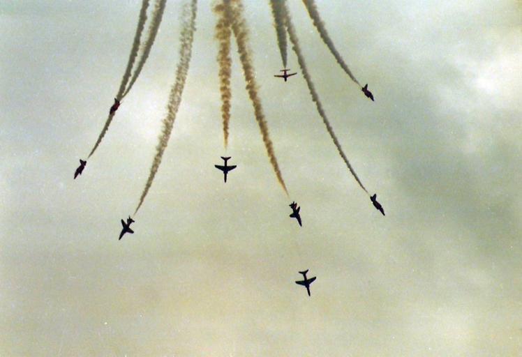Keywords: Red Arrows2 Ramstein 1984.jpg The Royal Air Force Red Arrows aerobatics team flying the Hawker Siddley Hawk T 1 at an airshow at Ramstein Air Base Rhineland-Palatinate Germany on 24 June 1984 own 1984-06-24 Cobatfor Aircraft formation flight of the Red Arrows BAE Hawk in the 1980s 24 June June 1984 in West Germany 1984 in aviation Aircraft at Ramstein Air Base |