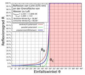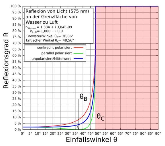 Keywords: Reflexionsgrad an der Grenzflaeche Wasser-Luft.svg en The diagram shows the calculated reflectivity for the reflection of light with wavelength of 575 nm at the interface of water to air as a function of incidence angle Optical constants for H2O taken from 'Handbook of Optical Constants of Solids II' Ed by Edward D Palik Academic Press Inc 1991 de Das Diagramm zeigt den berechneten Reflexionsgrades bei der Reflexion von Licht mit der Wellenlänge von 575 nm an der Grenzfläche von Wasser zu Luft in Abhängigkeit vom Einfallswinkel Die optischen Konstanten von Wasser stammen vom Buch 'Handbook of Optical Constants of Solids II' Ed von Edward D Palik Academic Press Inc 1991 own Cepheiden 2012-03-20 Refraction diagrams Optical properties of water Cc-zero |