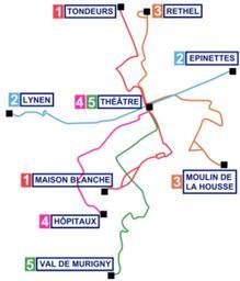 Keywords: ReseauTUR nuit.png en Schematic map of Reims' TUR buses night network fr Plan schématique du réseau de nuit des Transports Urbains de Reims en Own realization based on the official map fr Œuvre personnelle basée sur le plan officiel 2007-05-24 user daiima / fr user daiima Public Domain <br /><div align center > toccolours width 50 cellpadding 7 ccccff align center Plan du réseau de jour - Day services map </div> Public transport maps of Reims |