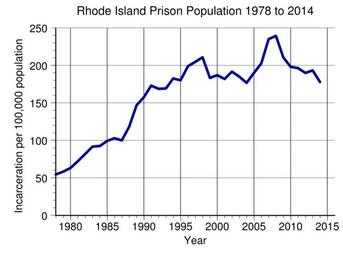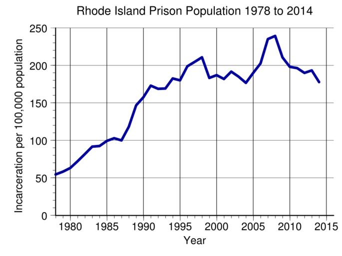 Keywords: Rhode Island Prison Population.svg en Rhode Island prison incarceration rate per 100 000 population from 1978 to 2014 Data from http //www bjs gov/index cfm ty nps BJS 2016-05-10 own Delphi234 other versions current annually Generated with Wikimedia SVG Chart SVG Chart/box cc-zero Demographics of Rhode Island Imprisonment and detention rates in the United States |