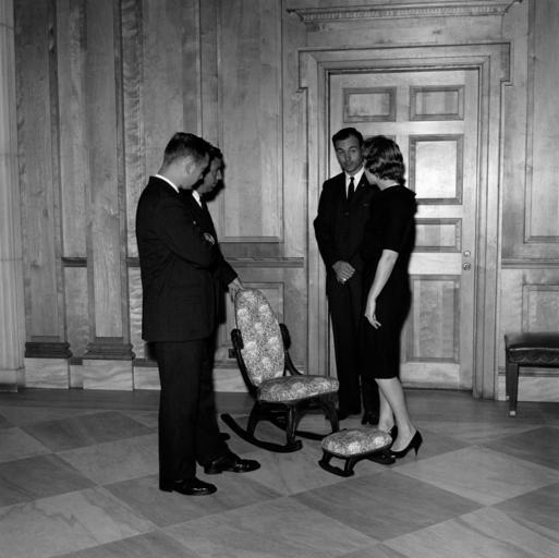 Keywords: u.s. national archives usnationalarchives jfk presidential library jfkpresidentiallibrary blackandwhite monochrome people black and white Original Caption: Rocking Chair Donated to White House We are looking for your help in identifying unknown people in our White House Photographs collection. If you have any information about this photograph, please post a comment, including any relevant sources, for the catalogers at the John F. Kennedy Presidential Library. Thank you! Local Identifier: JFKWHP-KN-19198 Created By: President (1961-1963 : Kennedy). Office of the Naval Aide to the President. (1961 - 1963) From: Robert Knudsen White House Photographs, 01/20/1961 - 12/19/1963 Contact: John F. Kennedy Library (LP-JFK), Columbia Point Boston, MA 02125-3398 Phone: 617-514-1600 Fax: 617-514-1652 Email: kennedy.library@nara.gov Production Dates: 10/17/1961 Scope and Content Note: This is a photograph of a rocking chair with footstool donated to White House by Memphis, Tennessee, Junior Chamber of Commerce. Four unidentified White House staff members. East Wing Lobby, White House, Washington, D.C. Persistent URL: JFK Library URL: www.jfklibrary.org/Asset-Viewer/Archives/JFKWHP-KN-19198.... Access Restrictions: Unrestricted Use Restrictions: Unrestricted Original Caption: Rocking Chair Donated to White House We are looking for your help in identifying unknown people in our White House Photographs collection. If you have any information about this photograph, please post a comment, including any relevant sources, for the catalogers at the John F. Kennedy Presidential Library. Thank you! Local Identifier: JFKWHP-KN-19198 Created By: President (1961-1963 : Kennedy). Office of the Naval Aide to the President. (1961 - 1963) From: Robert Knudsen White House Photographs, 01/20/1961 - 12/19/1963 Contact: John F. Kennedy Library (LP-JFK), Columbia Point Boston, MA 02125-3398 Phone: 617-514-1600 Fax: 617-514-1652 Email: kennedy.library@nara.gov Production Dates: 10/17/1961 Scope and Content Note: This is a photograph of a rocking chair with footstool donated to White House by Memphis, Tennessee, Junior Chamber of Commerce. Four unidentified White House staff members. East Wing Lobby, White House, Washington, D.C. Persistent URL: JFK Library URL: www.jfklibrary.org/Asset-Viewer/Archives/JFKWHP-KN-19198.... Access Restrictions: Unrestricted Use Restrictions: Unrestricted |