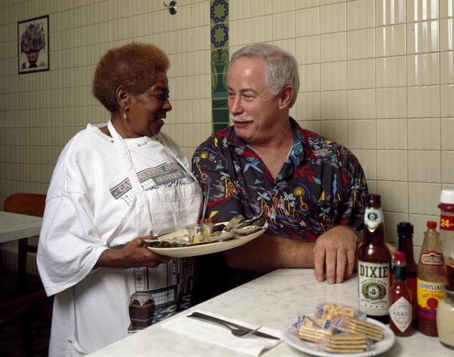Keywords: Ronnie Virgets Alma Griffin Casamentos New Orleans by Highsmith.jpg New Orleans writer and television personality Ronnie Virgets is served the house specialty ice-cold oysters on the half shell by Alma Griffin at Casamento's Seafood Restaurant in Uptown New Orleans Louisiana Photo by Carol Highsmith via Library of Congress website http //www loc gov/pictures/item/2011634555/ c-1996-2006 Creator Carol M Highsmith PD-Highsmith People of New Orleans Virgets Casamento's Restaurant New Orleans Oyster dishes New Orleans in the early 2000s |