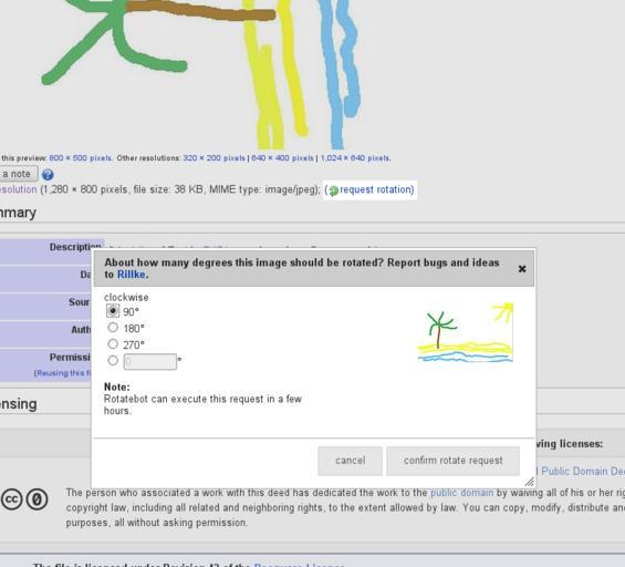 Keywords: RotateRequest, Gadget-RotateLink.png -pages 2011-10-14 21 37 UTC Script Rillke AaatestSonnepalmenstrand90 jpg and screenshot Saibo Next version 2011-11-23 File RotateRequest Gadget-RotateLink - 2011-11-23 en png highlighted the rotate request link Saibo Script itself see MediaWiki RotateRequest js Screen elements should be PD-ineligible The artwork is Beerware Cc-zero Original upload log This image is a derivative work of the following images File AaatestSonnepalmenstrand90 jpg licensed with Beerware Cc-zero 2011-10-14T21 16 01Z Saibo 1280x800 38830 Bytes <nowiki>Reverted to version as of 17 07 9 October 2011</nowiki> 2011-10-10T19 55 58Z Rotatebot 1280x800 44398 Bytes <nowiki>Bot Image rotated by 180° EXIF-Orientation set from 6 to 1 rotated 270° </nowiki> 2011-10-10T19 54 49Z Saibo 1280x800 38830 Bytes <nowiki>Reverted to version as of 17 07 9 October 2011</nowiki> 2011-10-09T20 58 42Z Rotatebot 1280x800 44398 Bytes <nowiki>Bot Image rotated by 180° EXIF-Orientation set from 6 to 1 rotated 270° </nowiki> 2011-10-09T20 55 50Z Luxo 1280x800 38830 Bytes <nowiki>Reverted to version as of 17 07 9 October 2011</nowiki> 2011-10-09T19 11 22Z Rotatebot 1280x800 44398 Bytes <nowiki>Bot Rotate 180°</nowiki> 2011-10-09T17 07 50Z Saibo 1280x800 38830 Bytes <nowiki> Orientation 6 Test for EXIF bugs please keep fingers away ; own 2011-10-09 ~~~ beerware Test images</nowiki> Uploaded with derivativeFX ImageNote 1 410 228 120 27 794 720 2 LangSwitch Start-Link Bild drehen The start link request rotation Le lien faire pivoter ImageNoteEnd 1 ImageNote 2 525 383 138 112 794 720 2 LangSwitch Bitte warte bei älteren Uploads bis das Vorschaubild angezeigt wird When requesting rotation for old uploads please wait until this thumbnail displays Pour obtenir un aperçu de la rotation attendez que l'image de prévisualisation se mette à jour ImageNoteEnd 2 Commons screenshots en Screenshots of MediaWiki gadgets |