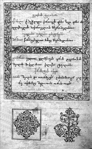 Keywords: Rustaveli poem. 1712 print, Tbilisi.JPG en The title page of the poem Knight in the Panther's Skin by Shota Rustaveli printed in Tbilisi in 1712 under the auspices of Vakhtang VI of Kartli საქართველ ს პარლამე ტის ერ ვ ული ბიბლი თეკა ვახტა გ -ის სტამბის გამ ცემები 1709-1722 შემდგ დალი მაჩაიძე თბ 2009 Author 1712 80px Printed books 1712 in Tbilisi Vakhtang VI The Knight in the Panther's Skin Mkhedruli book pages PD-old-100 |