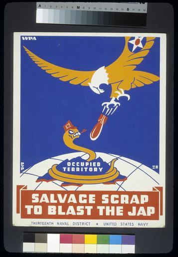 Keywords: Salvage Scrap propaganda poster orig.tif Poster for Thirteenth Naval District United States Navy showing a snake representing Japan being bombed by an eagle An example of American propaganda during World War II http //hdl loc gov/loc pnp/cph 3b49009 Library of Congress or 1940 1941 Phil Phul File Salvage Scrap propaganda poster orig tif Original TIF File Salvage Scrap propaganda poster orig jpg Original JPG File Salvage Scrap propaganda poster crop2 jpg This version has been restored Rotated with perspective crop Dirt smudges and small creases corrected Histogram adjusted File Salvage Scrap propaganda poster crop2 tif uncompressed restoration PD-USGov World War II propaganda |