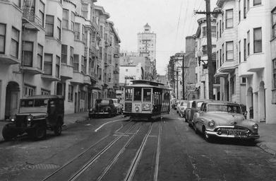 Keywords: cable car cablecar san francisco sanfrancisco street car streetcar ca california tracks trolley blackandwhite road monochrome outdoor architecture building city vehicle sidewalk black and white The note on the back of the photo says: "SF Muni. on crossover -- note common center rail" The amazing thing is, using some of the prominent buildings as landmarks, I was able to find the location where this photo was taken in google maps! The note on the back of the photo says: "SF Muni. on crossover -- note common center rail" The amazing thing is, using some of the prominent buildings as landmarks, I was able to find the location where this photo was taken in google maps! |