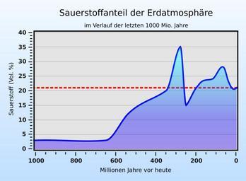 Keywords: Sauerstoffgehalt-1000mj.svg Dieses Diagramm stellt die Sauerstoffkonzentration in der Erdatmosphäre im Lauf der letzten Jahrmilliarde dar Als Referenz zeigt die gestrichelte rote Linie die heutige Konzentration von 21 an Es ist anzumerken dass die Zeiträume in denen vergangene Schwankungen der O2-Konzentration auftraten oft nur relativ grob abgeschätzt werden können Daher erhebt das Diagramm keinen Anspruch auf Exaktheit sondern kann nur einen groben à berblick der Entwicklung auf der Ebene erdgeschichtlicher Perioden geben Dieses Diagramm beruht auf Mittelwerten bzw à bereinstimmungen aus mehreren Publikationen<ref>http //webspace webring com/people/fg/gunnar_ries/ozwei html Gunnar Ries Dicke Luft bei den Sauriern</ref><ref>http //www geoversum de/forum/viewtopic php f 19 t 513 Geologie-Forum Geoversum Massensterben an der Perm-Trias Grenze Durch Sauerstoffmangel erstickt </ref><ref>http //www geophysik uni-kiel de/~sabine/DieErde/Erdgeschichte/klima-phanero html Die Zusammensetzung der Atmosphäre im Phanerozoikum diese ältere Quelle geht noch irrtümlich von einem nahe-rezenten Luftsauerstoffanteil bereits im Kambrium aus </ref><ref>http //www pflanzenforschung de/journal/aktuelles/erdgeschichte-fauna-und-flora-korreliert-mit-veraenderten-umweltbedingungen Erdgeschichte Fauna und Flora korreliert mit veränderten Umweltbedingungen</ref> Erläuterung der Kurve Nachdem bereits im Präkambrium die Ausgasung von Sauerstoff aus den Ozeanen begonnen hatte stieg der Sauerstoffgehalt etwa Anfang des Kambriums sprunghaft von 3 auf 12 an da nun endgültig alle Sauerstoffsenken abgesättigt waren Ungefähr zur gleichen Zeit setzte die Kambrische Explosion ein Während des Silur und Devon eroberten Pflanzen das Land während sich das Tierreich noch immer praktisch ausschließlich auf das Wasser beschränkte Dies löste einen weiteren schnellen und kontinuierlichen Anstieg der Sauerstoffkonzentration aus Im darauffolgenden Karbon hatte diese 35 erreicht<ref>http //www wissenschaft de/wissenschaft/hintergrund/214519 html wissenschaft de Gigantismus Fliegen und Antiaging Sauerstoffreiche Luft löste vor 300 Millionen Jahren einen Innovationsschub aus</ref> was Riesenwuchs vor allem bei Insekten begünstigte Auch Amphibien und erste Reptilien besiedelten mittlerweile das Land Massive vulkanische Tätigkeit verursachte am Perm-Trias-à bergang nicht nur ein Absacken des Sauerstoffgehalts auf 15 sondern auch das größte Massenaussterben der Erdgeschichte Die Sauerstoffkonzentration erholte sich nun über einen langen Zeitraum und erreichte Mitte des Jura wieder 26 in der Kreide vermutlich sogar 30 In dieser Zeit lebten auch die größten Saurier Das Ende der Kreidezeit wird durch ein Impaktereignis und einen Klimawandel mit Massenaussterben markiert Vor 40 Millionen Jahren betrug der Sauerstoffgehalt nur noch 23 und hatte den heutigen Wert von 21 vor 25 Millionen Jahren erreicht Seitdem ist er abgesehen von Schwankungen im Promillebereich konstant <references /> own 2007-07-18 LordToran PublicDomain OxygenLevel-1000ma svg English version is here valid SVG SVG geology Geochemical diagrams Climatological diagrams Created with QtiPlot |
