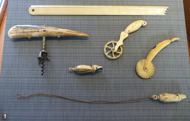 View Original: | Scrimshaw corkscrew (c. 1900), rule (c. 1915-1940), two jagging wheels (c. 1850-1900), two whistles (c. 1850-1900) - San Francisco Maritime Museum - San Francisco, CA - DSC04079.jpg (4868x3106) | |||
