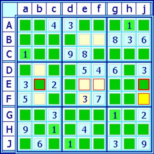 Keywords: Sdk ex03B.gif Exemple de sudoku avec élimination indirecte <br><br> <FONT SIZE 1 >Ici on travaille avec la valeur </FONT><FONT SIZE 1 COLOR red >1</FONT><FONT SIZE 1 > Les cases vides </FONT> <FONT SIZE 1 COLOR red >Ee</FONT><FONT SIZE 1 > et </FONT><FONT SIZE 1 COLOR red >Ef</FONT><FONT SIZE 1 > du pavé </FONT><FONT SIZE 1 COLOR 666666 >Yy</FONT><FONT SIZE 1 > permettent d'étendre les suppressions aux cases </FONT> <FONT SIZE 1 COLOR red >Eb</FONT><FONT SIZE 1 > et </FONT> <FONT SIZE 1 COLOR red >Ej</FONT> <FONT SIZE 1 > et l'on constate alors que dans le pavé </FONT> <FONT SIZE 1 COLOR red >Yz</FONT><FONT SIZE 1 > seule la case </FONT> <FONT SIZE 1 COLOR red >Fj</FONT><FONT SIZE 1 > en jaune reste libre et peut donc se voir attribuer la valeur </FONT> <FONT SIZE 1 COLOR red >1</FONT><FONT SIZE 1 > </FONT> <br> Pour voir d'autres exemples analogues élimination indirecte cliquer ici Image Sdk ex03A1 gif et Image Sdk ex03C1 gif <br> Voir l'article Résolution d'un sudoku http //fr wikipedia org/wiki/Résolution_d'un_sudoku sur Wikipédia own date Papy77 Sudoku |