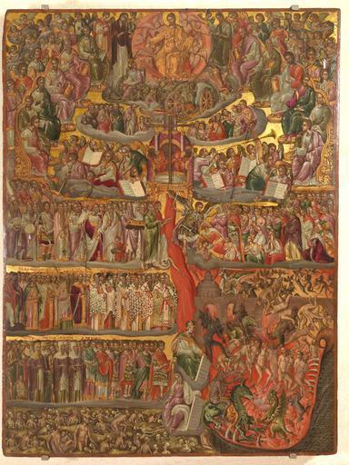 Keywords: Second Coming by G.Klontzas (16th c.).jpg Η Δευτέρα Παρουσία τέλη 16ου αιώνα 96x127εκ Γεώργιος Κλόντζας ΧΟΡΟC ΠΑΤΡΙΑΡΧΩ ΚΑΙ ΒΑCΙΛΕΩ ΧΟΡΟC ΙΕΡΕΩ ΑΡΧΙΕΡΕΩ ΚΑΙ ΠΑΤΡΙΑΡΧΩ ΧΟΡΟC ΑΓΙΩ ΓΥ ΑΙΚΩ ΚΑΙ ΒΑCΙΛΕΩ ΧΟΡΟC ΟCΙΩ ΑCΚΗΤΩ ΚΑΙ ΑΡΤΥΡΩ Γύρω α ό τον κατακόρυφο άξονα ου δημιουργείται α ό τον ύρινο οταμό ο ο οίος καταλήγει στην Κόλαση οργανώνεται αυτή η αράσταση της Δευτέρας Παρουσίας ένα α ό τα σημαντικότερα έργα του Κλόντζα Ε άνω και στο μέσο αριστάνεται ο Ιησούς Κριτής λαισιωμένος α ό τον Ιωάννη τον Πρόδρομο και την Παναγία τους α οστόλους και λήθος αγγέλων Στα όδια του βρίσκονται τα σύμβολα των ευαγγελιστών και νεκροί ου αναμένουν την ώρα της Κρίσης Πιο κάτω αριστάνονται η Ετοιμασία του θρόνου οι δίκαιοι σε τρεις διαδοχικές σειρές και στο κάτω μέρος η έγερση των νεκρών με τους σκελετούς ου αναδύονται α ό τους τάφους Δεξιά βρίσκεται ο αρχάγγελος ιχαήλ ου υψώνει το σ αθί α ειλώντας μία ομάδα ανθρώ ων και το υ όλοι ο τμήμα καταλαμβάνεται α ό την Κόλαση με την κάμινο του υρός το αναγεννησιακό οικοδόμημα με τον τρούλλο Τέλος κάτω στο μέσον της εικόνας εικονίζονται οι ροφήτες Δαβίδ και Ιεζεκιήλ με λάκες στις ο οίες υ άρχουν ε ιγραφές ου αναφέρονται στην Κόλαση http //eib xanthi ilsp gr/gr/icons asp late 16th century Creator Georgios Klontzas Georgios Klontzas Files uploaded by Shakko from various sources Icons of Last Judgment PD-old |