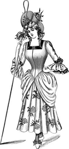 Keywords: ShepherdessSkirt of chintz.png Shepherdess outfit suitable to be worn to masquerade ball <br/> Skirt of chintz with large flowers Bodice and panier drapery of pink bun's-veiling Black velvet on sleeves and square-cut neck Large hat trimmed with flowers Masquerades Tableaux and Drills 1906 The Butterick Publishing Company PD PD-old Skirts Velvet in art Panniers clothing Images by Haabet Chintz Black and white drawings of dresses Black and white drawings of women |