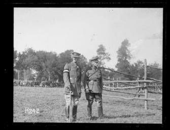 Keywords: blackandwhite photo border monochrome outdoor black and white The Commander in Chief, Sir Douglas Haig, and General Godley (left) standing in the ring at the Anzac Horse Show held during World War I. They are facing the camera. Photograph taken France 15 September 1917 by Henry Armytage Sanders. Inscriptions: Inscribed - Photographer's title on negative -bottom left: H242. Quantity: 1 b&w original negative(s). Physical Description: Dry plate glass negative 3.25 x 4.25 inches Sir Douglas Haig and General Godley at the Anzac Horse Show, World War I. Royal New Zealand Returned and Services' Association :New Zealand official negatives, World War 1914-1918. Ref: 1/4-009482-G. Alexander Turnbull Library, Wellington, New Zealand. natlib.govt.nz/records/23190855 The Commander in Chief, Sir Douglas Haig, and General Godley (left) standing in the ring at the Anzac Horse Show held during World War I. They are facing the camera. Photograph taken France 15 September 1917 by Henry Armytage Sanders. Inscriptions: Inscribed - Photographer's title on negative -bottom left: H242. Quantity: 1 b&w original negative(s). Physical Description: Dry plate glass negative 3.25 x 4.25 inches Sir Douglas Haig and General Godley at the Anzac Horse Show, World War I. Royal New Zealand Returned and Services' Association :New Zealand official negatives, World War 1914-1918. Ref: 1/4-009482-G. Alexander Turnbull Library, Wellington, New Zealand. natlib.govt.nz/records/23190855 |
