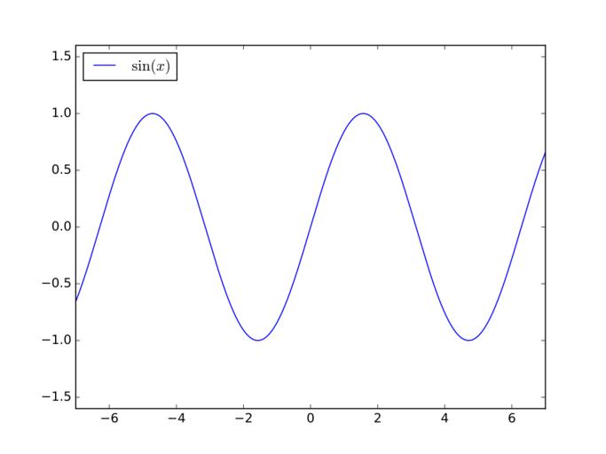 Keywords: Small-angle approximation for sine function (only sine function).svg en Diagram showing the sine function basis for File Small-angle approximation for sine function svg 2016-08-11 own http //kulla me Stephan Kulla User Stephan Kulla other versions <gallery> File Small-angle approximation for sine function svg Diagram with the small-angle approximation </gallery> other fields Matplotlib + import matplotlib pyplot as plt import numpy as np from mpl_toolkits axes_grid1 inset_locator import zoomed_inset_axes mark_inset xs np linspace -7 7 10001 sin_ys np sin xs plt plot xs sin_ys label \\sin x plt xlim -7 7 plt ylim -1 6 1 6 plt legend loc 2 plt savefig Small-angle approximation for sine function only sine function svg cc-zero Sine function |