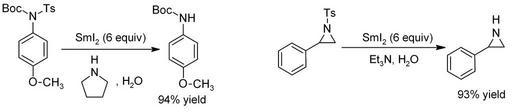 Keywords: SmI2detosylation.png samarium II iodide samarium II iodide for removal of tosyl groups to produce amines From Ankner T Hilmersson G Instantaneous Deprotection of Tosylamides and Esters with SmI<sub>2</sub>/Amine/Water Organic Letters 2009 11 503 “506 doi 10 1021/ol802243d Own Walkerma 2009-04-04 Functional group interconversions Tosyl group Samarium II iodide |