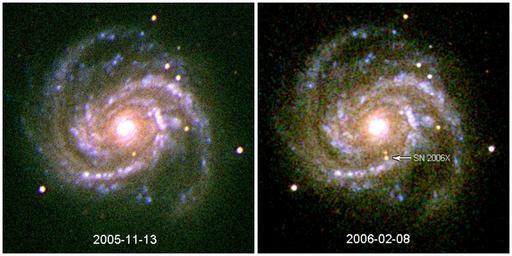 Keywords: SN2006X.jpg en Spiral Galaxy M100 before and after the appearance of supernova en SN 2006X Taken from en NASA website http //heasarc gsfc nasa gov/docs/swift/results/releases/images/SN2006X/ en wikipedia 2006-02-17 Livajo wikipedia en PD-USGov original upload log page en wikipedia SN2006X jpg 2006-02-17 02 42 Livajo 799×399×8 457777 bytes <nowiki>Spiral Galaxy M100 before and after the appearance of supernova SN2006X Taken from NASA website http //heasarc gsfc nasa gov/docs/swift/results/releases/images/SN2006X/</nowiki> Messier 100 SN 2006X Before and after |