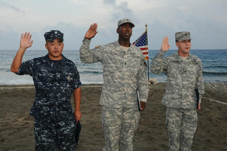Keywords: Soldier to Citizen DVIDS275325.jpg en Army Spc Carlos Baptista middle with the Rhode Island Army National Guard's 115th Military Police Battalion takes the United States Oath of Allegiance during his naturalization ceremony onboard Naval Station Guantanamo Bay April 19 Deployed to Joint Task Force Guantanamo Baptista was born in Cape Verde Navy Petty Officer 3rd Class Jo Kurosu machinist mate left a brig guard assigned to Naval Station Guantanamo Bay and Army Sgt Ardicio Galvao right a veterinary technician assigned to the Naval Station Guantanamo Bay Veterinary Clinic also took the oath becoming new American citizens 2010-04-19 Petty Officer 2nd Class Shane Arrington https //www dvidshub net/image/275325 100419-N-+++++-035 2010-05-03 12 25 GUANTANAMO BAY CU PD-USGov-Military-Navy Naval Station Guantanamo Bay Joint Task Force Guantanamo Images from DoD uploaded by Fæ |