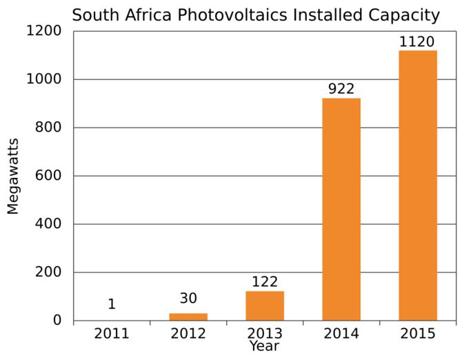 Keywords: South Africa Photovoltaics Installed Capacity.svg translate yes en Installed photovoltaics in South Africa from 2011 to 2015 http //www iea-pvps org/fileadmin/dam/public/report/PICS/IEA-PVPS_-__A_Snapshot_of_Global_PV_-_1992-2015_-_Final_2_02 pdf IEA-PVPS 2016-05-04 own Delphi234 other versions cc-zero Solar energy in South Africa Photovoltaic power statistics |