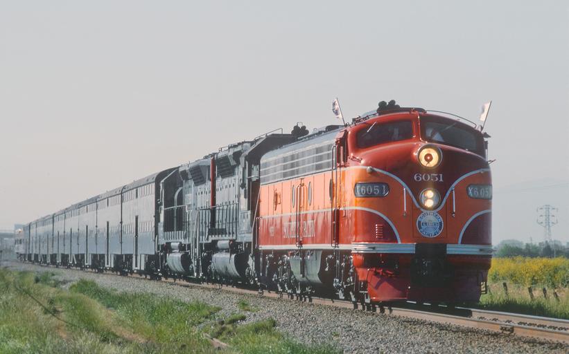 Keywords: southern pacific southernpacific railroad vehicle train locomotive outdoor Location not determined. The Southern Pacific ran two passenger specials from San Jose to Sacramento and return on the weekend of April 27 and 28, 1985. One on each day. On Sunday 6051 remained in Sacramento to become an artifact at the California State Railroad Museum. I'm pretty sure Roger shot the Saturday morning train to Sacramento. He put no captions on these slides. Some of the locations have been positively identified by landmarks. A few are a little soft or unknown. The power was E9A 6051 and commuter SDP45s 3201 and 3207. A Roger Puta Photograph Location not determined. The Southern Pacific ran two passenger specials from San Jose to Sacramento and return on the weekend of April 27 and 28, 1985. One on each day. On Sunday 6051 remained in Sacramento to become an artifact at the California State Railroad Museum. I'm pretty sure Roger shot the Saturday morning train to Sacramento. He put no captions on these slides. Some of the locations have been positively identified by landmarks. A few are a little soft or unknown. The power was E9A 6051 and commuter SDP45s 3201 and 3207. A Roger Puta Photograph Location not determined.