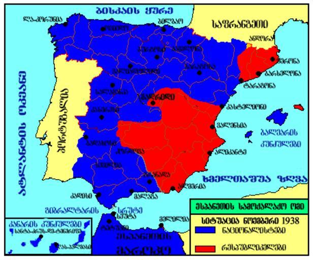Keywords: Spanish Civil War November 1938 ka.png რეზიუმე en Situation of the fronts of the Spanish Civil War November 1938 Nationalist zone in blue republican zone in red ka სიტუაცია ესპა ეთის სამ ქალაქ მის დრ ს 1938 წლის ემბერში http //commons wikimedia org/wiki/File Spanish_Civil_War_November_1938 png David1010 2009-07-21 Other versions/Spanish Civil War November 1938 Historical maps in Georgian 1938 in Spain Maps of the Spanish Civil War |
