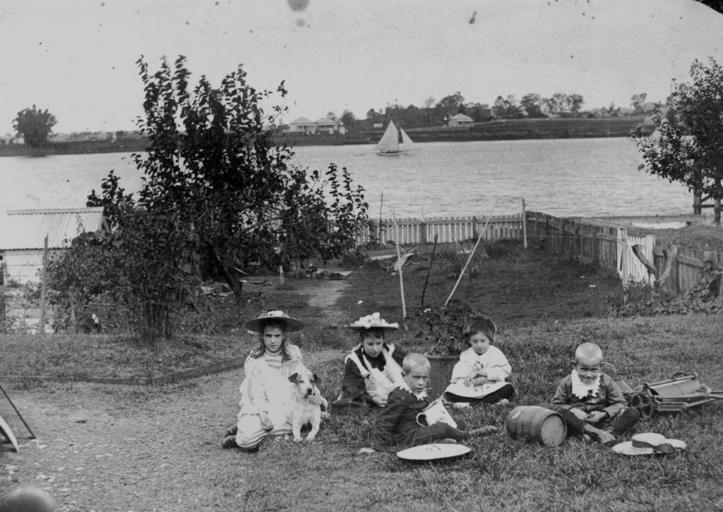 Keywords: StateLibQld 1 55004 Children from the Brown family in the backyard of their home at Newstead, Brisbane, 1890s.jpg en Children from the Brown family in the backyard of their home at Newstead Brisbane 1890s Florence Evelyn Leslie Ivy and Roy Brown in the backyard of their family home at Newstead Terrace Newstead ca 1890s A sailing boat is sailing along the Brisbane River in the background The children are playing with their dog and various other items including a jug and timber barrel An old fashioned lawn mower or roller lies on the ground to the right between 1890 1900 handle 10462/deriv/61130 Item is held by John Oxley Library State Library of Queensland PD-Australia StateLibQld-License Children of Queensland Backyards Brisbane River Dogs of Australia Houses in Newstead Queensland Brisbane in the 1890s Black and white photographs |