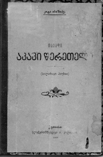 Keywords: Tavadi Akaki Tsereteli, Kita Abashidze 1908.jpg en Tavadi Akaki Tsereteli Kita Abashidze 1908 http //publish dlf ge/vaxtangvi/abashizekita/photogallery/wigni 20pirveli 20gamocema jpg publish dlf ge Kita Abashidze 1908 Kita Abashidze 1908 books Mkhedruli book covers 1908 in Georgia Akaki Tsereteli Source http //publish dlf ge/vaxtangvi/abashizekita/photo_gallery htm publish dlf ge PD-Art
