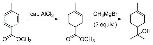 Keywords: Teprineol from isoprene and methyl acrylate.svg Preparatio of α-terpineol by Diels-Alder reaction of isoprene and methyl acrylate and Grignard reagent Own 2007-11-25 Calvero Diels-Alder reaction Grignard reactions Organic syntheses Terpineols Isoprene |