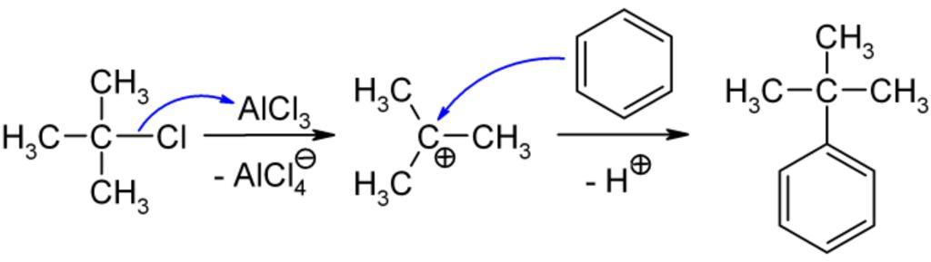 Keywords: Tert-Butylbenzene synthesis.png Synthesis of tert-butylbenzene by Friedel-Crafts alkylation with 2-chloro-2-methylpropane own work drawn with MDL ISISDraw<sup>®</sup> 2006-11-24 Dschanz public domain Reactions of benzene Friedel-Crafts alkylation Reactions of tert-butyl chloride Reactions of aluminium chloride |