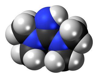 Keywords: Tetramethylguanidine-3D-spacefill.png Space-filling model of the tetramethylguanidine molecule a strong organic base Colour code 505050 Carbon C black<br> F0F0F0 Hydrogen H white<br> 3C50FA Nitrogen N blue<br> 2011-02-02 own DS Visualizer Jynto talk Ball-and-stick version cc-zero Guanidines Methyl compounds Images by Jynto |