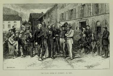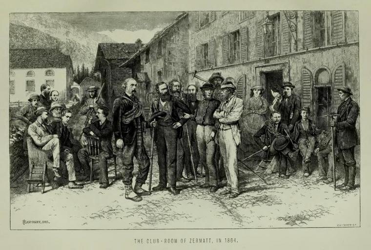 Keywords: The Club-Room of Zermatt in 1864 by Edward Whymper.jpg en The Club-Room of Zermatt in 1864 by Edward Whymper Group I F Crawford Grove with bowler hat Leslie Stephen sitting sideways George E Foster standing behind him Frank Walker soft hat the Rev J Robertson standing without beard A W Moore seated leaning forward Reginald S Macdonald sitting astride his chair Group II John Ball standing in the foreground rope across chest William Mathews T S Kennedy T G Bonney John Tyndall Ulrich Lauener behind ice-axe on shoulder Alfred Wills arms folded Group III Miss Lucy Walker Franz Andermatten seated with rope Joseph Maquignaz standing smoking Peter Taugwalder junior seated with bowler hat Pierre Perren standing extreme right before 1871 internet Edward Whymper other versions PD-Art PD-old-auto 1911 United Kingdom Engravings by Edward Whymper Alpine Club UK |