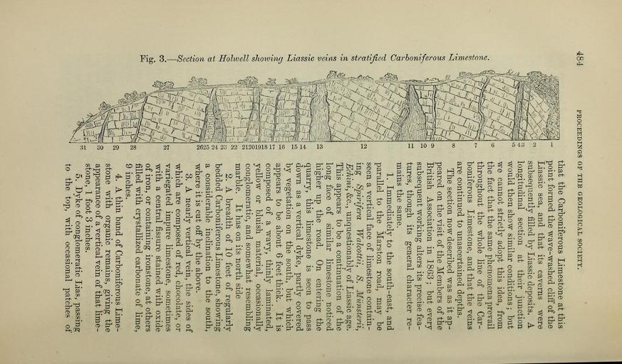 Keywords: The Quarterly journal of the Geological Society of London (13071204653).jpg 484 <br> PROCEEDINGS OP THE GEOLOGICAL SOCIETY <br> I' <br> be <br> that the Carboniferous Limestone at this <br> point formed the wave-washed cliff of the <br> Liassic sea and that its caverns were <br> subsequently filled by Liassic deposits A <br> longitudinal section at their junction <br> would then show similar conditions ; but <br> we cannot strictly adopt this idea from <br> the fact that the same phenomena prevail <br> throughout the whole line of the Car- <br> boniferous Limestone and that the veins <br> are continued to unascertained depths <br> The section now described was as it ap- <br> peared on the visit of the Members of the <br> British Association in 1863 ; but every <br> subsequent working alters its precise fea- <br> tures though its general character re- <br> mains the same <br> 1 Immediately to the south-east and <br> parallel to the Marston road may be <br> seen a vertical face of limestone contain- <br> ing Spirifera Walcottii S Munsterii <br> Echini c unquestionably of Liassic age <br> This appears to be a continuation of the <br> long face of similar limestone noticed <br> higher up the road On entering the <br> quarry this limestone is seen to pass <br> down as a vertical dyke partly covered <br> by vegetation on the south but which <br> appears to be about 6 feet thick It is <br> composed of a wavy thinly laminated <br> yellow or bluish material occasionally <br> conglomeratic and somewhat resembling <br> marble It has on its north side <br> 2 A breadth of 10 feet of regularly <br> bedded Carboniferous Limestone showing <br> a considerable inclination to the south <br> where it is cut off by the above <br> 3 A nearly vertical vein the sides of <br> which are composed of red chocolate or <br> variegated impure limestone sometimes <br> with a central fissure stained with oxide <br> of iron or containing ironstone at others <br> filled with crystallized carbonate of lime <br> 9 inches <br> 4 A thin band of Carboniferous Lime- <br> stone with organic remains giving the <br> appearance of a vertical vein of that lime- <br> stone 1 foot 3 inches <br> 5 Dyke of conglomeratic Lias passing <br> to the top with occasional patches of 36345239 112028 51125 Page 484 Text v 23 http //www biodiversitylibrary org/page/36345239 1867 Geological Society of London NameFound Echini NameConfirmed Echini NameFound Spirifera NameConfirmed Spirifera NameBankID 4349332 Biodiversity Heritage Library The Quarterly journal of the Geological Society of London v 23 1867 Geology Periodicals Smithsonian Libraries bhl page 36345239 dc identifier http //biodiversitylibrary org/page/36345239 smithsonian libraries Information field Flickr posted date ISOdate 2014-03-10 Check categories 2015 August 26 CC-BY-2 0 BioDivLibrary https //flickr com/photos/61021753 N02/13071204653 2015-08-26 13 53 58 cc-by-2 0 PD-old-70-1923 The Quarterly journal of the Geological Society of London 1867 Photos uploaded from Flickr by Fæ using a script |