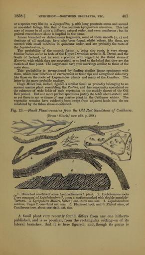 Keywords: The Quarterly journal of the Geological Society of London (12981025095).jpg 1858 <br> MIJECHISON NOETHERN HIGHLANDS ETC <br> 407 <br> or a species very like it; a Lycopodites 3 with long prostrate stems and secund <br> or one-sided foliage like that of the common Lycopodium clavatum This last <br> may of course be of quite a different natural order and even coniferous ; but its <br> general resemblance alone is implied in the name <br> Linear branched or dichotomous fragments some of them smooth i 2 and <br> destitute of all markings have also been found whilst others like them are <br> covered with small tubercles in quincunx order and are probably the roots of <br> the Lepidodendron 4 <br> The probabihty of the smooth forms i being also roots is very strong <br> Similar bodies occur in beds of the Upper Devonian series in N Devon and the <br> South of Ireland and in such a position with regard to the fluted stems of <br> Knorria with which they are associated as to lead to the belief that they are the <br> rootlets of that plant The larger ones have even markings similar to those of the <br> main stem <br> This probability is strengthened by finding similar linear specimens with <br> them which bear tubercles or excrescences at their tips and along their sides very <br> like those on the roots of Leguminous plants and many of the Conifers The <br> latter is the more probable analogy <br> Hugh Miller has indeed figxired a similar fossil as probably belonging to an <br> ancient marine plant resembhng the Zostera and has reasonably speculated on <br> the existence of wide fields of such vegetation on the muddy shores of the Old <br> Red period But our more perfect specimens justify the belief above-stated ; and <br> as yet there is no evidence of any marine plant in the Caithness schists The <br> vegetable remains have evidently been swept from adjacent lands into the sea <br> inhabited by the fishes above-mentioned <br> Fig 13 ” Fossil Plant-remains from the Old Red Sandstone of Caithness <br> From ' Siluria ' new edit p 290 <br> / 1 Branched rootlets of some Lycopodiaceous plant 2 Dichotomous roots <br> \ ery common of Lepidodendron upon a surface marked with double annelide- <br> urrows 3 Lycopodites Milleri Salter ; one-third nat size 4 Lepidodendron <br> nothum linger one-third nat size 5 Flattened root and 6 Fluted stem of <br> Coniferous tree about one-sixth nat size <br> A fossil plant very recently found diJffers from any one hitherto <br> published and is so peculiar from the rectangular setting-on of its <br> lateral branches that it is here figured ; and though its genus is 36161964 111474 51125 Page 407 Text v 15 http //www biodiversitylibrary org/page/36161964 1859 Geological Society of London NameFound Knorria NameConfirmed Knorria NameBankID 4921585 NameFound Lepidodendron NameConfirmed Lepidodendron EOLID 13132167 NameBankID 4921583 NameFound Lepidodendron nothum NameFound Lycopodiaceous NameFound Lycopodites NameConfirmed Lycopodites NameBankID 4853060 NameFound Lycopodium clavatum NameConfirmed Lycopodium clavatum EOLID 599072 NameBankID 2644342 NameFound Zostera NameConfirmed Zostera EOLID 107291 NameBankID 2659793 Biodiversity Heritage Library The Quarterly journal of the Geological Society of London v 15 1859 Geology Periodicals Smithsonian Libraries bhl page 36161964 dc identifier http //biodiversitylibrary org/page/36161964 smithsonian libraries Information field Flickr posted date ISOdate 2014-03-07 Check categories 2015 August 26 CC-BY-2 0 BioDivLibrary https //flickr com/photos/61021753 N02/12981025095 2015-08-26 14 55 36 cc-by-2 0 PD-old-70-1923 The Quarterly journal of the Geological Society of London 1859 Photos uploaded from Flickr by Fæ using a script |
