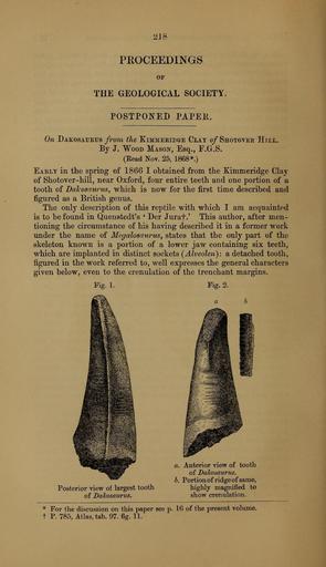 Keywords: The Quarterly journal of the Geological Society of London (12961283933).jpg of this reptile with which I am acquainted <br> is to be found in Quenstedt's ' Ber Juraf ' This author after men- <br> tioning the circumstance of his having described it in a former work <br> under the name of MegalosauruSy states that the only part of the <br> skeleton known is a portion of a lower jaw containing six t eth <br> which are implanted in distinct sockets Alveolen a detached tooth <br> figured in the work referred to well expresses the general characters <br> given below even to the crenulation of the trenchant margins <br> Fig 1 <br> Fig 2 <br> Posterior view of largest tooth <br> of Dakosaurus <br> a Anterior view of tooth <br> of Dakosaurus <br> b Portion of ridge of same <br> highly magnified to <br> show crenulation <br> For the discussion on this paper see p 16 of the present volume <br> t P 785 Atlas tab 97 fig 11 36103063 111288 51125 Page 218 Text v 25 http //www biodiversitylibrary org/page/36103063 1869 Geological Society of London NameFound Dakosatirus NameFound Dakosaurus NameConfirmed Dakosaurus EOLID 4472928 NameBankID 4136479 Biodiversity Heritage Library The Quarterly journal of the Geological Society of London v 25 1869 Geology Periodicals Smithsonian Libraries bhl page 36103063 dc identifier http //biodiversitylibrary org/page/36103063 smithsonian libraries Information field Flickr posted date ISOdate 2014-03-06 Check categories 2015 August 26 CC-BY-2 0 BioDivLibrary https //flickr com/photos/61021753 N02/12961283933 2015-08-26 15 54 37 cc-by-2 0 PD-old-70-1923 The Quarterly journal of the Geological Society of London 1869 Photos uploaded from Flickr by Fæ using a script |