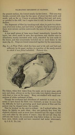 Keywords: The Quarterly journal of the Geological Society of London (12960190415).jpg PALEOLITHIC IMPLEMENTS AT CEAYFOED <br> 545 <br> the present surface the lowest nearly six feet lower This area was <br> thickly covered with chips for the space of about ten feet north and <br> south and as far as I know at present fifteen feet east and west <br> or parallel to the cliff; but I expect that it will be found to extend <br> further <br> The fragments of flint lay touching each other in parts to a thick- <br> ness of several inches and had fallen so lightly that in several places <br> there were minute cavities underneath the mass of larger and flatter <br> flakes <br> A few small pieces of bone were found immediately beneath the <br> layer ; but above could be seen fine specimens and smaller ones in <br> abundance mostly incrusted with sand cemented by iron oxide to <br> the bones and this occasionally included one or more flakes in the <br> mass fi g 2 Chips are found connected together by the same means <br> Pig 2 ” A Flint Flahe ivhich has been used at the side and butt end <br> adherent by its upper surface to a portion of the sandy matrix <br> in ivhich it was found imbedded l atural size <br> The flakes when first taken from the sand are in most cases quite <br> new and clean always so on the lower side very slightly discoloured <br> with dust or iron on the upper Many are studded with small con- <br> cretions of white carbonate of lime <br> Though the workman had abundance of material to work on he <br> seems to have found the flints very obstinate as may be seen from <br> the difficulty he had in procuring good heart pieces of flint and the <br> patient way he chipped away the outside <br> That he worked on the spot is evident As I noticed before the <br> flakes lie lightly on each other ; they are perfectly free from the <br> slightest abrasion such as must have occurred had the edges rubbed <br> over each other by the action of water ; they did not fall from the <br> clifl into the water for occasionally long flakes broken in two have <br> been seen which could not have occurred had water intervened ; <br> Q J G S No 144 2p 36090936 111264 51125 Page 545 Text 36 http //www biodiversitylibrary org/page/36090936 1880 Geological Society of London Biodiversity Heritage Library The Quarterly journal of the Geological Society of London v 36 1880 Geology Periodicals Smithsonian Libraries bhl page 36090936 dc identifier http //biodiversitylibrary org/page/36090936 smithsonian libraries Information field Flickr posted date ISOdate 2014-03-06 Check categories 2015 August 26 CC-BY-2 0 BioDivLibrary https //flickr com/photos/61021753 N02/12960190415 2015-08-26 15 50 40 cc-by-2 0 PD-old-70-1923 The Quarterly journal of the Geological Society of London 1880 Photos uploaded from Flickr by Fæ using a script |