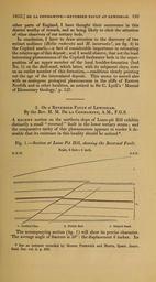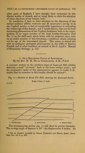 Keywords: The Quarterly journal of the Geological Society of London (12684314643).jpg 1852 DE LA CONDAMINE REVERSED FAULT AT LEWISHAM 193 <br> other parts of England I have thought their occurrence in this <br> district worthy of remark and as heing likely to elicit the attention <br> of other observers of our tertiary beds <br> In conclusion I have to draw attention to the discovery of two <br> extinct molluscs Helix ruderata and H incarnata see fig 4 in <br> the Copford marls ” a fact of considerable importance in estimating <br> the relative age of this deposit ; and I would observe that not the least <br> interesting phsenomenon of the Copford freshwater beds is the super- <br> position of an upper member of the local boulder-formation bed <br> No 1 on the shell-marl which latter with its subjacent clays rests <br> on an earlier member of this formation ” conditions clearly pointing <br> out the age of the intercalated deposit This seems to accord also <br> with an analogous geological phsenomenon in the cliffs of Eastern <br> Norfolk and in other localities as noticed in Sir C Lyell's Manual <br> of Elementary Geology ' p 127 <br> 2 On a Reversed Fault at Lewisham <br> By the Rev H M De la Condamine A M F G S <br> A RECENT section on the northern slope of Loam-pit Hill exhibits <br> distinctly a small reversed fault in the lower tertiary strata; and <br> the comparative rarity of this phsenomenon appears to render it de- <br> sirable that its existence in this locality should be noticed <br> Fig 1 ” Section at Loam Pit Hill showing the Reversed Fault <br> Scale 6 feet l inch <br> N N w <br> S S E <br> 1 London Clay 2 Pebble Bed 3 Striped Sand <br> The accompanying section fig 1 will show its precise character <br> The average angle of fracture is 30° the displacement 6 inches Its <br> See an instance recorded by Messrs Prestwich and Morris Quart Journ <br> Geol Soc vol ii p 402 35461199 109911 51125 Page 193 Text v 8 http //www biodiversitylibrary org/page/35461199 1852 Geological Society of London NameFound H incarnata Biodiversity Heritage Library The Quarterly journal of the Geological Society of London v 8 1852 Geology Periodicals Smithsonian Libraries bhl page 35461199 dc identifier http //biodiversitylibrary org/page/35461199 smithsonian libraries Information field Flickr posted date ISOdate 2014-02-21 Check categories 2015 August 26 CC-BY-2 0 BioDivLibrary https //flickr com/photos/61021753 N02/12684314643 2015-08-27 12 55 47 cc-by-2 0 PD-old-70-1923 The Quarterly journal of the Geological Society of London 1852 Photos uploaded from Flickr by Fæ using a script |