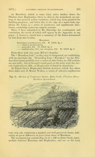 Keywords: The Quarterly journal of the Geological Society of London (12512821125).jpg 1872 DAIXTREE GEOLOGY OF QUEENSLAND 279 <br> At Marathon which is some forty miles further down the <br> Flinders than Hughcnden there is close to the homestead an out- <br> crop of fine-grained yellow sandstone which has been quarried for <br> building-purposes ; and below this to the edge of a water-hole sup- <br> plying the house is a series of sandstones and argillaceous lime- <br> stones containing numerous organic remains <br> These I have submitted to Mr Etheridge for examination and <br> correlation the result of which will appear in the Appendix to my <br> paper ; I however attach here a summary of the forms determined <br> by him from this locality <br> Marathon <br> Inoceramus marathonensis Eth PI XXII fig 1 <br> allied to problematiciis <br> pernoidcs Eth PL XXII fig 3 <br> multiplicatus Stol var elongatus Eth PI XXII fig 2 <br> From these beds also came M'Coy's Reptilia <br> The Marathon beds as they may be designated are undulating <br> with an uncertain dip Proceeding from Marathon up the Flin- <br> ders river most probably over a series of older beds no cliff-sections <br> are met with ; but at Stewart's Avash-pool on the main road the Avi- <br> eida Jiiic/hendensis Eth of Hughenden is found in abimdance <br> At Hobert Grey's Hughenden Station however which lies about <br> three miles east of Moinit Walker a scries of calcareo-argillaceous <br> Fig G ” Section of Cretaceous Strata Betts Creel- Flinders River <br> Northern Queensland <br> beds crop out containing a marked and well-pi eserved fauna indi- <br> cating no great difference in fades from those of Marathon <br> The accompanying section Fig 6 of a cliff on Betts Creek inter- <br> mediate between Marathon and Hughenden and one on the bank 34985292 108770 51125 Page 279 Text v 28 http //www biodiversitylibrary org/page/34985292 1872 Geological Society of London NameFound Inoceramus marathonensis NameFound Reptilia NameConfirmed Reptilia EOLID 1703 NameBankID 2549792 Biodiversity Heritage Library The Quarterly journal of the Geological Society of London v 28 1872 Geology Periodicals Smithsonian Libraries bhl page 34985292 dc identifier http //biodiversitylibrary org/page/34985292 smithsonian libraries Information field Flickr posted date ISOdate 2014-02-14 Check categories 2015 August 26 CC-BY-2 0 BioDivLibrary https //flickr com/photos/61021753 N02/12512821125 2015-08-27 09 58 57 cc-by-2 0 PD-old-70-1923 The Quarterly journal of the Geological Society of London 1872 Photos uploaded from Flickr by Fæ using a script |