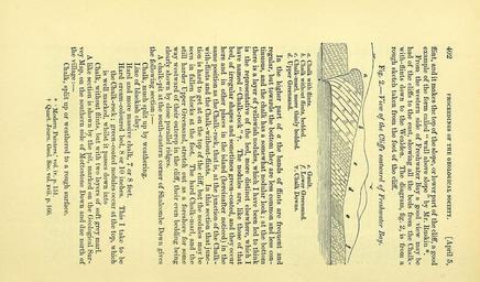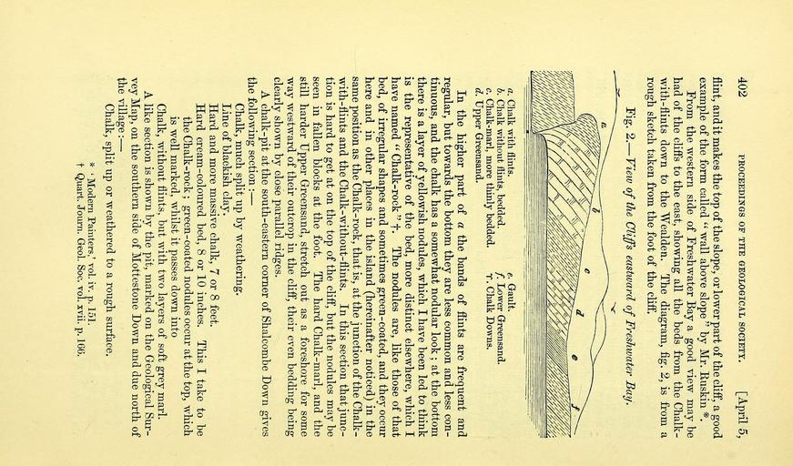 Keywords: The Quarterly journal of the Geological Society of London (12471273733).jpg 402 <br> PROCEEDINGS OF THE GEOLOGICAL SOCIETY April 5 <br> flint and it makes the top of the slope or lower part of the cliif a good <br> example of the form called wall above slope by Mr Buskin <br> Prom the western side of Freshwater Bay a good view may be <br> had of the cUiFs to the east showing all the beds from the Chalk- <br> with-flints down to the Wealden The diagram fig 2 is from a <br> rough sketch taken from the foot of the cliff <br> Fig 2 ” View of the Cliff's eastward of Freshwater Bay <br> a Chalk with flints e Gault <br> h Chalk without flints bedded f Lower Greensand <br> c Chalk-marl more thinly bedded r Chalk Downs <br> d Upper Greensand <br> In the higher part of a the bands of flints are frequent and <br> regular but towards the bottom they are less common and less con- <br> tinuous and the chalk has a somewhat nodular look ; at the bottom <br> there is a layer of yellowish nodules which I have been led to think <br> is the representative of the bed more distinct elsewhere which I <br> have named Chalk- rock f The nodules are like those of that <br> bed of irregular shapes and sometimes green-coated and they occur <br> here and in other places in the island hereinafter noticed in the <br> same position as the Chalk-rock that is at the junction of the Chalk- <br> with-flints and the Chalk- without-flints In this section that junc- <br> tion is hard to get at on the top of the cliff but the nodules may be <br> seen in fallen blocks at the foot The hard Chalk-marl and the <br> still harder Upper Greensand stretch out as a foreshore for some <br> way westward of their outcrop in the chff their even bedding being <br> clearly shown by close parallel ridges <br> A chalk-pit at the south-eastern corner of Shalcombe Down gives <br> the following section ; ” <br> Chalk much split up by weathering <br> Line of blackish clay <br> Hard and more massive chalk 7 or 8 feet <br> Hard cream-coloured bed 8 or 10 inches This I take to be <br> the Chalk -rock ; green-coated nodules occur at the top which <br> is well marked whilst it passes down into <br> Chalk without flints but with two layers of soft grey marl <br> A like section is shown by the pit marked on the Geological Sur- <br> vey Map on the southern side of Mottestone Down and due north of <br> the village ” <br> Chalk split up or weathered to a rough surface <br> ' Modern Painters ' vol iv p 151 <br> t Quart Joiu n Geol Soc vol xvii p 166 <br> I 34892076 108495 51125 Page 402 Text v 21 http //www biodiversitylibrary org/page/34892076 1865 Geological Society of London Biodiversity Heritage Library The Quarterly journal of the Geological Society of London v 21 1865 Geology Periodicals Smithsonian Libraries bhl page 34892076 dc identifier http //biodiversitylibrary org/page/34892076 smithsonian libraries Information field Flickr posted date ISOdate 2014-02-12 Check categories 2015 August 26 CC-BY-2 0 BioDivLibrary https //flickr com/photos/61021753 N02/12471273733 2015-08-27 10 02 33 cc-by-2 0 PD-old-70-1923 The Quarterly journal of the Geological Society of London 1865 Photos uploaded from Flickr by Fæ using a script |