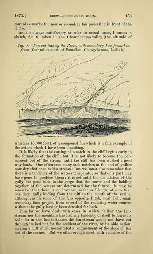 Keywords: The Quarterly journal of the Geological Society of London (13369170803).jpg 1873 <br> DREW UPPER-INDUS BASIN <br> 453 <br> towards e marks the new or secondary fan projecting in front of the <br> cliff' b <br> As it is always satisfactory to refer to actual cases I annex a <br> sketch fig 9 taken in the Changchenmo valley the altitude of <br> Fig 9 ” Fan cut into by the River ivith secondary Fan formed in <br> front four miles south of Pamzalan Changchenmo Ladakh <br> which is 15 000 feet of a compound fan which is a fair example of <br> the action which I have been describing <br> It is likely that the cutting of a notch in the cliff begins early in <br> the formation of the cliff; but it is not likely to become the per- <br> manent bed of the stream until the cliff has been worked a good <br> way back One often sees many such notches at the end of gullies <br> now dry that once held a stream but we must also remember that <br> there is a tendency of the waters to separate; so that only part may <br> have gone to produce them ; it is not until the denudation of the <br> gully has gone back to the gorge that the course and the holding <br> together of the waters are determined for the future It may be <br> remarked that there is no instance as far as I know of more than <br> one deep gully leading from the cliff to the mouth of the ravine <br> although as in some of the fans opposite Pitak near Leh small <br> secondary fans project from several of the radiating water-courses <br> without the gully having been denuded far back <br> Thus far we have dealt with cases in which neither the fan- <br> stream nor the mountain has had any tendency of itself to lower its <br> bed ; for in the last instances the fan-stream would not have cut <br> through its bed but for the accident of the river by its side action <br> making a cliff which necessitated a readjustment of the slope of the <br> bed of the ravine But we often enough meet with evidence of the 39051391 120601 51125 Page 453 Text v 29 http //www biodiversitylibrary org/page/39051391 1873 Geological Society of London Biodiversity Heritage Library The Quarterly journal of the Geological Society of London v 29 1873 Geology Periodicals Smithsonian Libraries bhl page 39051391 dc identifier http //biodiversitylibrary org/page/39051391 smithsonian libraries Information field Flickr posted date ISOdate 2014-03-24 Check categories 2015 August 26 CC-BY-2 0 BioDivLibrary https //flickr com/photos/61021753 N02/13369170803 2015-08-26 10 56 03 cc-by-2 0 PD-old-70-1923 The Quarterly journal of the Geological Society of London 1873 Photos uploaded from Flickr by Fæ using a script |