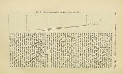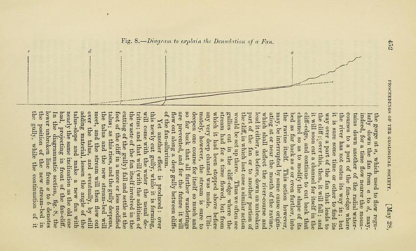 Keywords: The Quarterly journal of the Geological Society of London (13369164983).jpg 452 <br> PROCEEDINGS OF THE GEOLOGICAL SOCIETY May 28 <br> the gorge at a which used to flow regu- <br> larly clown the fan from a to d may <br> indeed for a time flow nearer the moun- <br> tains down another of the radial water- <br> courses to a part of the fan- edge where <br> the river has not eaten its way in; but <br> it is sure some time or other to find its <br> way over a part of the fan that leads to <br> the cliff ; Yover this then it will fall ; and <br> it will soon cut a channel for itself in the <br> cliff-edge and continue to cut back that <br> channel so as to modify the shape of its <br> bed as far back as a or even further into <br> the ravine itself This action however <br> may be interrupted by some cause origin- <br> ating at or near the mouth of the ravine <br> which shall deflect the river-course and <br> lead it either as before down an unbroken <br> part of the fan or to another portion of <br> the cliff in which last case a similar action <br> would be set up there Thus we often see <br> gullies cut in the cliff-edge where the <br> stream had for a time flowed but from <br> which it had been stopped above before <br> any very deep channel was made Ulti- <br> mately however the stream is sure to <br> deepen one course for itself so much and <br> so far back that all further wanderings <br> are prevented and for the future it will <br> flow out along a deep gully between cliffs <br> of the fan-alluvium <br> Yet another effect is produced over <br> this newly cut gully while it is forming <br> will come with the water the usual de- <br> tritus ; and that will with the addition of <br> the waste of the fan itself involved in the <br> cutting of the gully fall and settle at the <br> foot of the cliff in a more or less modified <br> talus ; as this rises and the gully deepens <br> the talus and the new stream-bed will <br> meet and the stream will then flow out <br> over the talus and eventually by still <br> adding material lessen the angle of the <br> talus-slope and make a new fan with <br> nearly the same inclination as the old one <br> had projecting in front of the fan-cliff <br> In the diagrammatic section fig 8 the <br> lower unbroken line from a to b denotes <br> the position of the new stream-bed in <br> the gully while the continuation of it 39051390 120601 51125 Page 452 Text v 29 http //www biodiversitylibrary org/page/39051390 1873 Geological Society of London Biodiversity Heritage Library The Quarterly journal of the Geological Society of London v 29 1873 Geology Periodicals Smithsonian Libraries bhl page 39051390 dc identifier http //biodiversitylibrary org/page/39051390 smithsonian libraries Information field Flickr posted date ISOdate 2014-03-24 Check categories 2015 August 26 CC-BY-2 0 BioDivLibrary https //flickr com/photos/61021753 N02/13369164983 2015-08-26 10 56 00 cc-by-2 0 PD-old-70-1923 The Quarterly journal of the Geological Society of London 1873 Photos uploaded from Flickr by Fæ using a script |