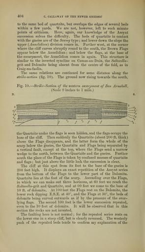 Keywords: The Quarterly journal of the Geological Society of London (13204794655).jpg 404 C CALLAWAY ON THE NEWER GNEISSIC <br> to the same bed of quartzite but overlaps the edges of several beds <br> within a few yards We are not however left to such minute <br> points of criticism Here again our knowledge of the Assynt <br> succession solves the difficulty The beds of quartzite in contact <br> with the gneiss are of the Seamy type ; and lower down the slope the <br> upper Annelidiau division comes in Further west at the corner <br> where the cliff curves abruptly round to the south the Erown Flags <br> appear below the Annelidian ; and below the flags at the base of <br> the escarpment the Annelidian comes in again This structure is <br> similar to the inverted syncline on Camas-an-Duin the Salter etta- <br> grit and Dolomite being absent from the centre of the fold as in <br> Cr aig-n a-f aolin <br> The same relations are continued for some distance along the <br> strike- section fig 10 The ground now rising towards the south <br> Fig 10 ” Strike- Section of the western escarpment of Ben Arnaboll <br> Scale 8 inches to 1 mile <br> N S <br> the Quartzite under the flags is soon hidden and the flags occupy the <br> base of the cliff Then suddenly the Quartzite about 200 ft thick <br> above the Flags disappears and the latter form the whole of the <br> scarp below the gneiss the Quartzite and Flags being separated by <br> a vertical fault except at the top where the Flags send a narrow <br> wedge to the north between the Quartzite and the gneiss Further <br> south the place of the Flags is taken by confused masses of quartzite <br> and flags ; but just above the little loch the succession is clear <br> The cliff at this spot from its foot to the base of the gneiss is <br> 200 feet high It displays an exact repetition of the Assynt series <br> from the bottom of the Flags to the lower part of the Dolomite <br> Quartzite lies at the foot of the scarp Ascending over the Flags <br> in which we can make out three horizons at 60 feet we reach the <br> S alter ella-grit and Quartzite and at 90 feet we come to the base of <br> 10 ft of dolomite At 100 feet the Flags rest on the Dolomite the <br> lower rock dipping E S E at 40° and the Flags at 30° the beds of <br> dolomite being curved outwards as if by the pressure of the over- <br> lying flags The second 100 feet is the lower succession repeated <br> even to the 10 feet of dolomite It will be observed that in this <br> section the rocks are not inverted <br> The faulting here is not normal ; for the repeated series rests on <br> the lower one in a steep cliff but is clearly reversed The westerly <br> push of the repeated beds tends to confirm my explanation of the 36929011 113681 51125 Page 404 Text 39 http //www biodiversitylibrary org/page/36929011 1883 Geological Society of London Biodiversity Heritage Library The Quarterly journal of the Geological Society of London v 39 1883 Geology Periodicals Smithsonian Libraries bhl page 36929011 dc identifier http //biodiversitylibrary org/page/36929011 smithsonian libraries Information field Flickr posted date ISOdate 2014-03-16 Check categories 2015 August 26 CC-BY-2 0 BioDivLibrary https //flickr com/photos/61021753 N02/13204794655 2015-08-26 12 51 16 cc-by-2 0 PD-old-70-1923 The Quarterly journal of the Geological Society of London 1883 Photos uploaded from Flickr by Fæ using a script |
