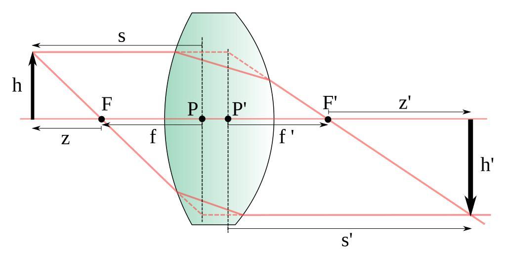 Keywords: ThickConvexLens-real.svg en Relationship between an object and an image not in case of a thin lens ja 薄レンズ近似しない場合の物と像との関係( ja レンズの公式) Own ja User きたし 2008-11-27 Finite imaging diagrams of positive lenses