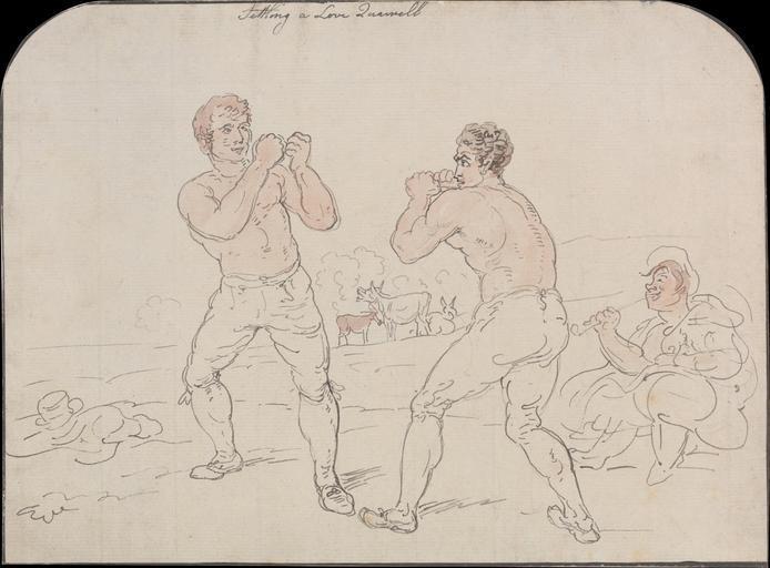 Keywords: Thomas Rowlandson - Settling a Love Quarrell - Google Art Project.jpg Inscribed in dark gray ink upper center Settling a Love Quarrell ; in blue ink verso center PAUL MELLON COLLECTION collector's stamp with x written in middle of stamp in graphite; in graphite verso lower right No Ref No Inscription _Signed_and_Dated Not signed not dated Not on View Pen and gray ink with pink and brown wash over graphite with black ink lined border on medium moderately textured blued white laid paper fighting cattle men woman trees genre subject love special url_id -gHYVO78mh4ViQ PD-old-100-1923 1827 Drawings and watercolours by Thomas Rowlandson Google Art Project works by Thomas Rowlandson |