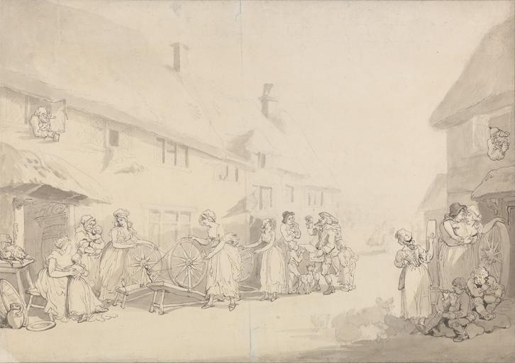 Keywords: Thomas Rowlandson - A Village Scene with Girls Spinning - Google Art Project.jpg Inscribed in gray ink verso lower left Village Scene in Cornwall Dev crossed out E E in graphite and brown red ink lower center of Rowlandson ; in graphite lower right D 1384 ; in brown ink center right 42 30 9 underline 81 5 underline 86 14 underline 100 26 underline 60 14 underline 14 4 - 4 39 ; in graphite lower right This one to be laid down flat ; in ink lower center PAUL MELLON COLLECTION collector's stamp Inscription _Signed_and_Dated Not signed not dated Not on View Pen in gray and black ink with gray wash over graphite on moderately thick moderately textured blued white laid paper dogs animals spinning wheels cat domestic cat piglets pigs children people by age group girls men women windows village buildings genre subject spinning textile process special url_id KAHwI1ZJ3lRbYQ PD-old-100-1923 1827 Drawings and watercolours by Thomas Rowlandson Google Art Project works by Thomas Rowlandson Spinning in art |