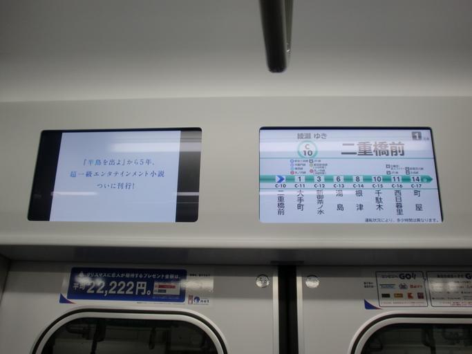 Keywords: Tokyo Metro Chiyoda Line 16000 TVIS LCD display Ayase Depot 20101128.JPG TVIS LCD passenger information display inside Tokyo Metro Chiyoda Line 16000 series EMU car at Ayase Depot Open Day 京メトロ16000系のLCD式旅客案内表示器(TVIS) ja File TokyoMetro16000-tvis JPG 2010-11-28 ja user STTrain ja Japanese Wikipedia STTrain relicense Tokyo Metro 16000 series Train interiors of Tokyo Metro Liquid crystal displays in trains in Japan November 2010 in Japan 2010 in rail transport in Japan Photographs taken on 2010-11-28 Taken with Casio Exilim EX-Z270 |
