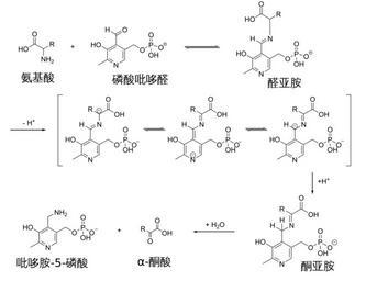 Keywords: Transamination mechanism (zh-cn).svg reaction of an amino acid with pyridoxal-phosphate to a Schiff-base aldimine Transamination between an amino acid an pyridoxal-phosphate Pyridoxalphosphat_aldimin svg Transaminierung_mechanismus_de svg 2011-03-29 05 45 UTC Pyridoxalphosphat_aldimin svg User Alcibiades Transaminierung_mechanismus_de svg User Alcibiades derivative work Shakiestone <span class signature-talk >talk</span> translation Transaminierung_mechanismus_de svg </nowiki> Uploaded with derivativeFX Coenzymes Organophosphates Acid-base reactions Organic reactions |