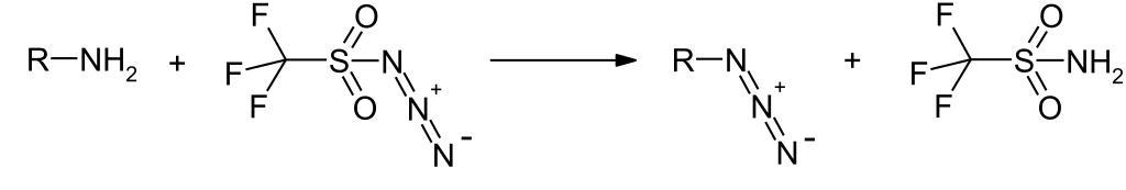 Keywords: Trifluoromethanesulfonyl azide reaction02.svg en Formation of organic azides from amines and trifluoromethanesulfonylazide de Herstellung von organischen Aziden durch Umsetzung von Aminen mit Trifluormethansulfonylazid own Steffen 962 2015-01-18 PD-chem Trifluoromethanesulfonyl azide Chemical syntheses Cc-zero |
