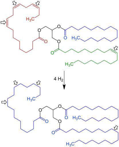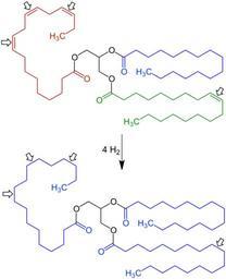 Keywords: Triglyceride Hydrogenation V.6.svg en Triglyceride_Hydrogenation de Fetthärtung own Jü 2012-06-12 Hydrogenation reactions Cc-zero
