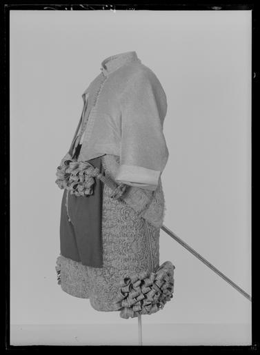 Keywords: Tröja av mönstrad silverbrokad, ca 1650-1660 - Livrustkammaren - 10304.tif LSH artwork sv Buren av Karl X Gustav 1622-1660 vid kröningen 1654-06-06 okänd tillverkare <br/>Tröja Livplagg av innocenttyp Skuren i 2 lika stora framstycken vars framkanter följer staden 1 helt bakstycke 1 ståndkrage 10 små skört samt 2 svängda stycken för varje ärm Plagget är sytt av rik silverbrokad och har även foder av silverbrokad i annat mönster Tröjan är försedd med mellanfoder av linnelärft 20x19 tr/cm2 och planschetter triangelformade styvnader nedtill i de spetsiga framkanterna Kragen är på insidan fodrad med vitt mönstrat siden av samma sort som återkommer i tröjan till dräkt nr 3401 och har mellanfoder av linnelärft 25x21 tr/cm2 med inlagd styvnad troligen fiskben Vänsterframstycke har 21 knapphål för de bevarade 21 knapparna i höger framstycke Knapphålen är sydda med vitt högertvinnat silke 8 stygn/cm över 1 tråd Knapparna d 1 3 cm är med silverlansomspunnet vitt högertvinnat silke trind kantilj och silverlan Tre stycken likadana knappar sitter i kragen men motsvarande tränsar saknas <br/>Silverbrokaden som utgör tröjans övertyg benämnes rik silverduk Den kan beskrivas på följande sätt Vådbredd minst 50 cm 72x18 tr/cm2 Varp av tunt vitt otvinnat silke De grövre otvinnade vita inslagstrådarna bildar dels botten med silverlan i varje inslag dels blommönster av flotterade trådar med högertvinnade silverlan i varje sådant inslag Stad 1 cm 10 gröna 4 orange 12 gröna 1 vit tråd Mönsterrapport 8 8 x 8 8 cm Mönstret är symmetriskt uppbyggt med halvnaturalistiska blommor sammanhållna i rosettlika arrangemang Ärmarna är avsedda att ha den främre sömmen öppen På de motsatta bakre sömmarna har ärmarna sprund nedtill vid handleden Man har avsett att vika upp ärmensnederkant till uppslag Förutom de 10 trapetsformade skörten sitta i midjan på tröjansinsida 7 st stroppar klädda med foderbrokaden vardera med 2 hål för de 7 silverhakarna ibyxlinningen 4 sitter på den vänstra sidan och 3 på den högra Silverbrokaden som utgörtröjans foder benämnes också i de äldre inventarierna silverduk <br/>Denna har en vådbredd av minst 51 cm c a 70 x 18 á 19 tr/cm2 Mycket tunn och tät varp avvita otvinnade silkestrådar där dessa bildar botteninslag ha de försetts med silverlan pårätan De flotterande mönstertrådarna är däremot endast av vitt silke Ripsvävnad Stad 0 8 cm 12 gröna 4 gulorange 10 gröna 1 tjockare vit tråd - vävnad i tuskaft Mönsterrapport h 7 7 cm b 6 6 cm Det är ett halvnaturalistiskt blomstermönster med enkarakteristisk figur som erinrar om en fjäder Samma silverbrokad återkommer som foder itröjan nr 3389 All garnering och dekor av spetsar har sprättats bort och tröjans foder harskadats upptill Kragen har även brännskada vilket tyder på att den lämnats till utbrännning På kragens insida har man med bläck märkt plagget N 43 en åtgärd somstammar från 1789 original caption Karl X Gustavs kröning < 1654 brocade d1 - dräkt - yttermaterial material silverbrokad - linen - silk Färg vit material siden - silk Färg vit material silke - silver - silver - brocade d1 - dräkt - yttermaterial material silverbrokad LRK Karl X Gustav av Sverige Gallica 1945 Sweden - A Royal Treasury 1988-1989 Slottet brinner 1997 1648 Westfaliska freden 1998 Modelejon 2002 Les arts décoratifs sous Louis XIII 2002 Sweden and Europe 1632-1792 2003-2004 Silver - Makt o prakt i barockens Sverige 2003-2004 place of origin original filename LN_B14571_017451 67897 inventory number LRK 31304 10304 CC0 Tröja av mönstrad silverbrokad ca 1650-1660 - Livrustkammaren - 10304-negative tif <gallery caption Different images of same object > File Tröja av mönstrad silverbrokad ca 1650-1660 - Livrustkammaren - 18866 tif File Tröja av mönstrad silverbrokad ca 1650-1660 - Livrustkammaren - 10303 tif File Dräkt i rött och silvertyg som tillhört Karl X Gustav - Livrustkammaren - 65159 tif File Tröja av mönstrad silverbrokad ca 1650-1660 - Livrustkammaren - 70230 tif File Tröja av mönstrad silverbrokad ca 1650-1660 - Livrustkammaren - 78761 tif File Tröja av mönstrad silverbrokad ca 1650-1660 - Livrustkammaren - 53091 tif File Tröja av mönstrad silverbrokad ca 1650-1660 - Livrustkammaren - 61640 tif File Tröja av mönstrad silverbrokad ca 1650-1660 - Livrustkammaren - 78789 tif File Dräkt i rött och silvertyg som tillhört Karl X Gustav - Livrustkammaren - 73721 tif File Tröja av mönstrad silverbrokad ca 1650-1660 - Livrustkammaren - 70202 tif File Tröja av mönstrad silverbrokad ca 1650-1660 - Livrustkammaren - 35972 tif File Dräkt i rött och silvertyg som tillhört Karl X Gustav - Livrustkammaren - 56598 tif File Tröja av mönstrad silverbrokad ca 1650-1660 - Livrustkammaren - 1744 tif File Tröja av mönstrad silverbrokad ca 1650-1660 - Livrustkammaren - 44530 tif </gallery> Coronation of Charles X of Sweden Shirts Media contributed by LSH 2014-11 |