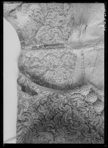 Keywords: Tröja av mönstrad silverbrokad, ca 1650-1660 - Livrustkammaren - 35972.tif LSH artwork sv Buren av Karl X Gustav 1622-1660 vid kröningen 1654-06-06 okänd tillverkare <br/>Tröja Livplagg av innocenttyp Skuren i 2 lika stora framstycken vars framkanter följer staden 1 helt bakstycke 1 ståndkrage 10 små skört samt 2 svängda stycken för varje ärm Plagget är sytt av rik silverbrokad och har även foder av silverbrokad i annat mönster Tröjan är försedd med mellanfoder av linnelärft 20x19 tr/cm2 och planschetter triangelformade styvnader nedtill i de spetsiga framkanterna Kragen är på insidan fodrad med vitt mönstrat siden av samma sort som återkommer i tröjan till dräkt nr 3401 och har mellanfoder av linnelärft 25x21 tr/cm2 med inlagd styvnad troligen fiskben Vänsterframstycke har 21 knapphål för de bevarade 21 knapparna i höger framstycke Knapphålen är sydda med vitt högertvinnat silke 8 stygn/cm över 1 tråd Knapparna d 1 3 cm är med silverlansomspunnet vitt högertvinnat silke trind kantilj och silverlan Tre stycken likadana knappar sitter i kragen men motsvarande tränsar saknas <br/>Silverbrokaden som utgör tröjans övertyg benämnes rik silverduk Den kan beskrivas på följande sätt Vådbredd minst 50 cm 72x18 tr/cm2 Varp av tunt vitt otvinnat silke De grövre otvinnade vita inslagstrådarna bildar dels botten med silverlan i varje inslag dels blommönster av flotterade trådar med högertvinnade silverlan i varje sådant inslag Stad 1 cm 10 gröna 4 orange 12 gröna 1 vit tråd Mönsterrapport 8 8 x 8 8 cm Mönstret är symmetriskt uppbyggt med halvnaturalistiska blommor sammanhållna i rosettlika arrangemang Ärmarna är avsedda att ha den främre sömmen öppen På de motsatta bakre sömmarna har ärmarna sprund nedtill vid handleden Man har avsett att vika upp ärmensnederkant till uppslag Förutom de 10 trapetsformade skörten sitta i midjan på tröjansinsida 7 st stroppar klädda med foderbrokaden vardera med 2 hål för de 7 silverhakarna ibyxlinningen 4 sitter på den vänstra sidan och 3 på den högra Silverbrokaden som utgörtröjans foder benämnes också i de äldre inventarierna silverduk <br/>Denna har en vådbredd av minst 51 cm c a 70 x 18 á 19 tr/cm2 Mycket tunn och tät varp avvita otvinnade silkestrådar där dessa bildar botteninslag ha de försetts med silverlan pårätan De flotterande mönstertrådarna är däremot endast av vitt silke Ripsvävnad Stad 0 8 cm 12 gröna 4 gulorange 10 gröna 1 tjockare vit tråd - vävnad i tuskaft Mönsterrapport h 7 7 cm b 6 6 cm Det är ett halvnaturalistiskt blomstermönster med enkarakteristisk figur som erinrar om en fjäder Samma silverbrokad återkommer som foder itröjan nr 3389 All garnering och dekor av spetsar har sprättats bort och tröjans foder harskadats upptill Kragen har även brännskada vilket tyder på att den lämnats till utbrännning På kragens insida har man med bläck märkt plagget N 43 en åtgärd somstammar från 1789 original caption Karl X Gustavs kröning < 1654 brocade d1 - dräkt - yttermaterial material silverbrokad - linen - silk Färg vit material siden - silk Färg vit material silke - silver - silver - brocade d1 - dräkt - yttermaterial material silverbrokad LRK Karl X Gustav av Sverige Gallica 1945 Sweden - A Royal Treasury 1988-1989 Slottet brinner 1997 1648 Westfaliska freden 1998 Modelejon 2002 Les arts décoratifs sous Louis XIII 2002 Sweden and Europe 1632-1792 2003-2004 Silver - Makt o prakt i barockens Sverige 2003-2004 place of origin original filename LN_B14404_017284 67897 inventory number LRK 31304 35972 CC0 Tröja av mönstrad silverbrokad ca 1650-1660 - Livrustkammaren - 35972-negative tif <gallery caption Different images of same object > File Tröja av mönstrad silverbrokad ca 1650-1660 - Livrustkammaren - 18866 tif File Tröja av mönstrad silverbrokad ca 1650-1660 - Livrustkammaren - 10303 tif File Dräkt i rött och silvertyg som tillhört Karl X Gustav - Livrustkammaren - 65159 tif File Tröja av mönstrad silverbrokad ca 1650-1660 - Livrustkammaren - 70230 tif File Tröja av mönstrad silverbrokad ca 1650-1660 - Livrustkammaren - 78761 tif File Tröja av mönstrad silverbrokad ca 1650-1660 - Livrustkammaren - 53091 tif File Tröja av mönstrad silverbrokad ca 1650-1660 - Livrustkammaren - 61640 tif File Tröja av mönstrad silverbrokad ca 1650-1660 - Livrustkammaren - 78789 tif File Dräkt i rött och silvertyg som tillhört Karl X Gustav - Livrustkammaren - 73721 tif File Tröja av mönstrad silverbrokad ca 1650-1660 - Livrustkammaren - 70202 tif File Tröja av mönstrad silverbrokad ca 1650-1660 - Livrustkammaren - 10304 tif File Dräkt i rött och silvertyg som tillhört Karl X Gustav - Livrustkammaren - 56598 tif File Tröja av mönstrad silverbrokad ca 1650-1660 - Livrustkammaren - 1744 tif File Tröja av mönstrad silverbrokad ca 1650-1660 - Livrustkammaren - 44530 tif </gallery> Coronation of Charles X of Sweden Shirts Media contributed by LSH 2014-11 |