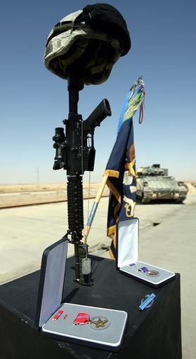 Keywords: U.S. Army battalion honors second fallen soldier since arrival in Iraq DVIDS25205.jpg en A Kevlar helmet M4 Carbine rifle military dog tags and two medals - the Bronze Star and Purple Heart - were several items used to represent the memorial of Spc Michael J Potocki during a memorial service June 29 2006 in Hit Iraq Potocki a 21-year-old native of Baltimore Md and 2003 graduate of Patterson Senior High School was killed in action June 26 2006 while conducting combat operations in Hit - a city of 30 000 in Iraq's Al Anbar Province Potocki was an infantryman with the Friedburg Germany-based 1st Battalion 36th Infantry Regiment - the U S military unit assigned to this region of Iraq Potocki is the second U S soldier killed in the region since the battalion arrived in February He was a new breed of infantry soldier but more importantly he was a helluva person said Potocki's team leader Cpl William McCoy during the ceremony He is what I would want another country to see an American as Photo by Staff Sgt Jim Goodwin 2006-06-28 Staff Sgt James Goodwin https //www dvidshub net/image/25205 25205 2006-07-06 12 35 HIT IQ PD-USGov Advanced Combat Optical Gunsight on M4 carbine Images from DoD uploaded by Fæ 36th Infantry Regiment United States M4 carbine Soldier's Cross Bronze Star Medal United States Purple Heart United States |